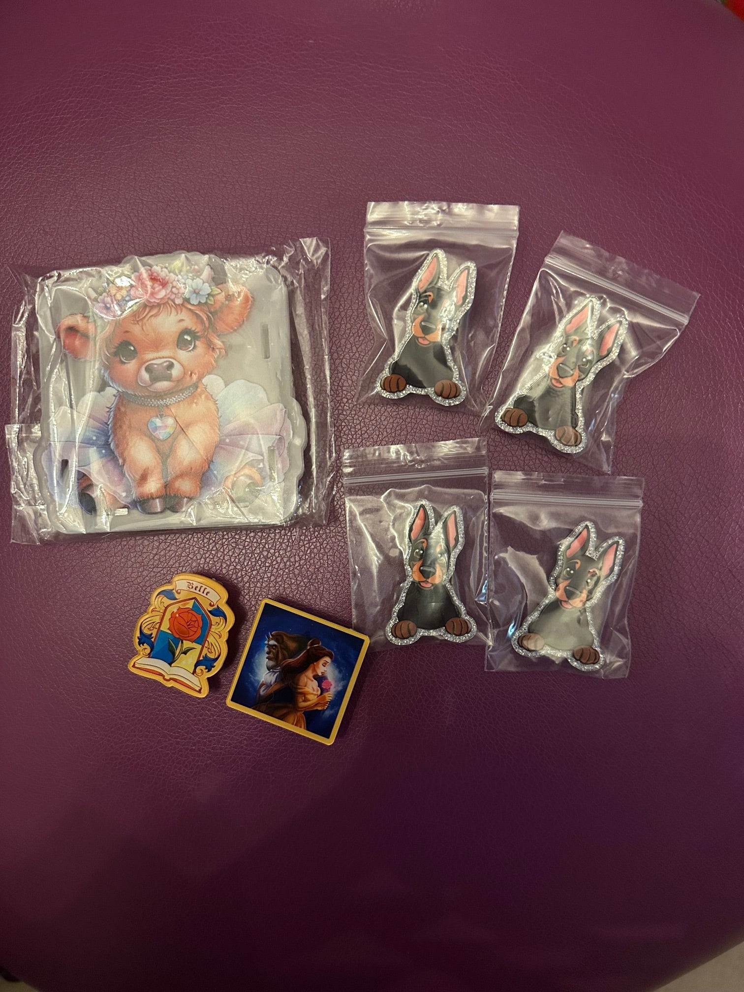 2 Kona magnets 2 Kona clips 2 Beauty and Beast pic clips One Highland cow in tutu pen holder
